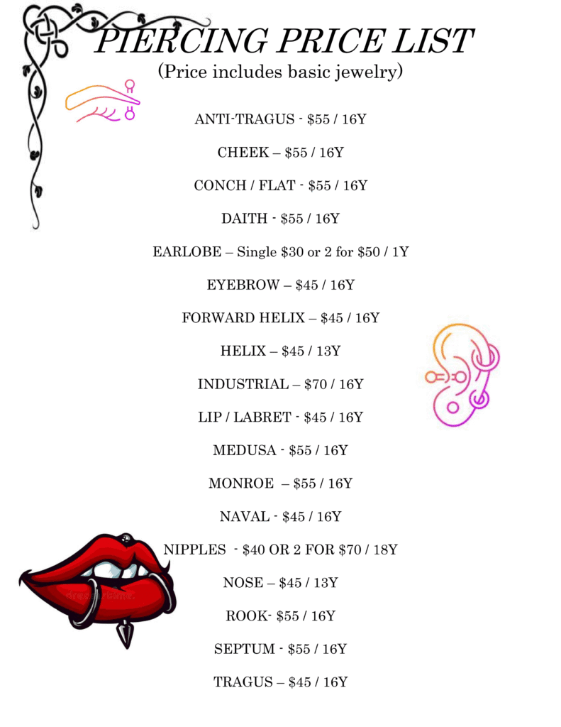 From classic earlobe and navel piercings to more unique options like daith, rook, and industrial, we cater to all your piercing needs. Visit our shop to discuss your piercing preferences and receive expert advice on aftercare to ensure a smooth healing process.